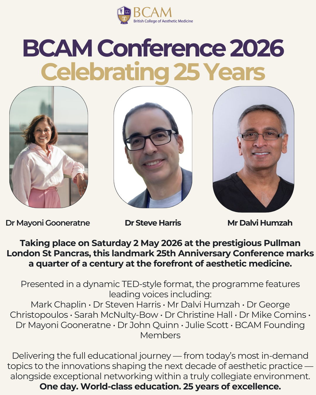 This milestone event marks a quarter of a century at the forefront of aesthetic medicine. Designed in a dynamic TED-style format, the 2026 conference will bring together outstanding speakers such as Mark Chaplin, Dr Steven Harris, Mr Dalvi Humzah, Dr George Christopoulos, Sarah McNulty-Bow, Dr Christine Hall, Dr Mike Comins, Dr Mayoni Gooneratne, Dr John Quinn, Julie Scott and BCAM’s Founding Members.